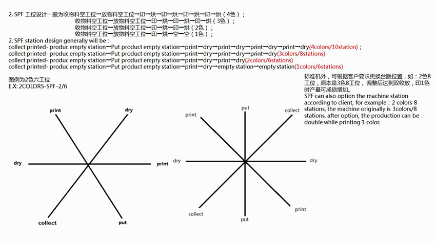 5、采用多工位旋轉工作臺,其中一個工位擺放工件,( 一、兩、三)四個工位印刷,( 一、兩、三)四個工位烘干,一個工位取工件,全部工位可同時高速運行工作。